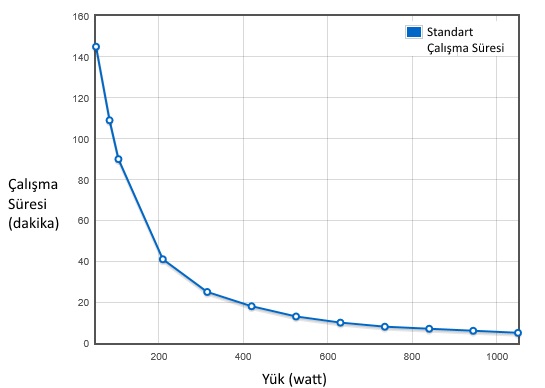 Akü çalışma süreleri yaklaşık olarak verilmiştir ve bağlı cihaz, konfigürasyon, akü aşı, ortam ısısı gibi parametreler ile değişkenlik gösterebilir. Yükün Volt değil Watt olarak gösterildiğine dikkat ediniz. 1500Volt=1050Watt