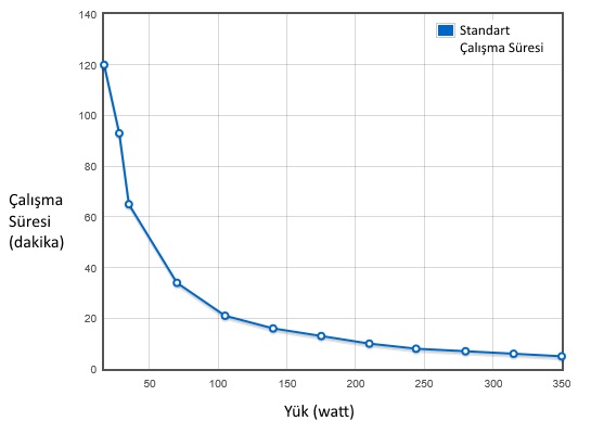 Akü çalışma süreleri yaklaşık olarak verilmiştir ve bağlı cihaz, konfigürasyon, akü aşı, ortam ısısı gibi parametreler ile değişkenlik gösterebilir. Yükün Volt değil Watt olarak gösterildiğine dikkat ediniz. 500Volt=350Watt