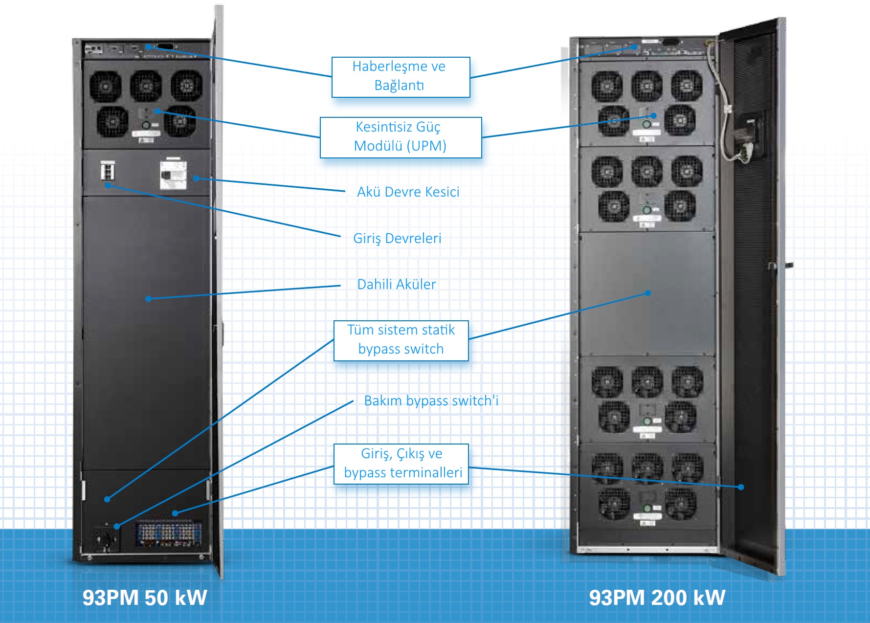 93PM UPS, çift çevrim modunda %97 verimlilk sunarak standartları en üst düzeye taşıyor. Bu özelliği ile işletim maliyetlerinde ciddi tasarruf sağlar.